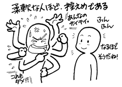 柔軟な人ほど、自分が有利な場所にいることを知っている。だから、控えめであることが多い。彼らは、「男なんてー!」「ヘテロなんてー!」という一方的な言辞を、たいてい黙って聞いている。